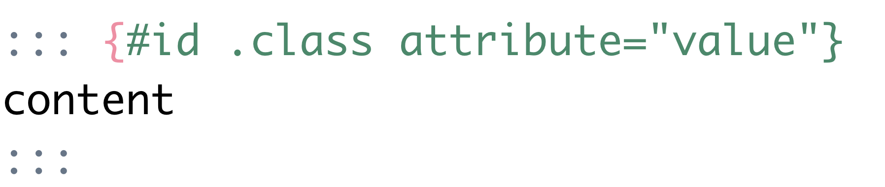 ::: - Div start and end#id - label.class - behaviorattribute=value - customization:::{.callout-tip}