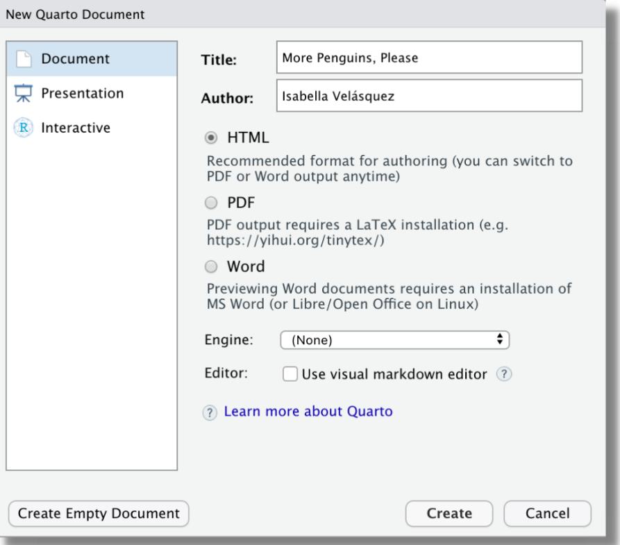 To create a new document in RStudio, go to File > New File > Quarto Document: