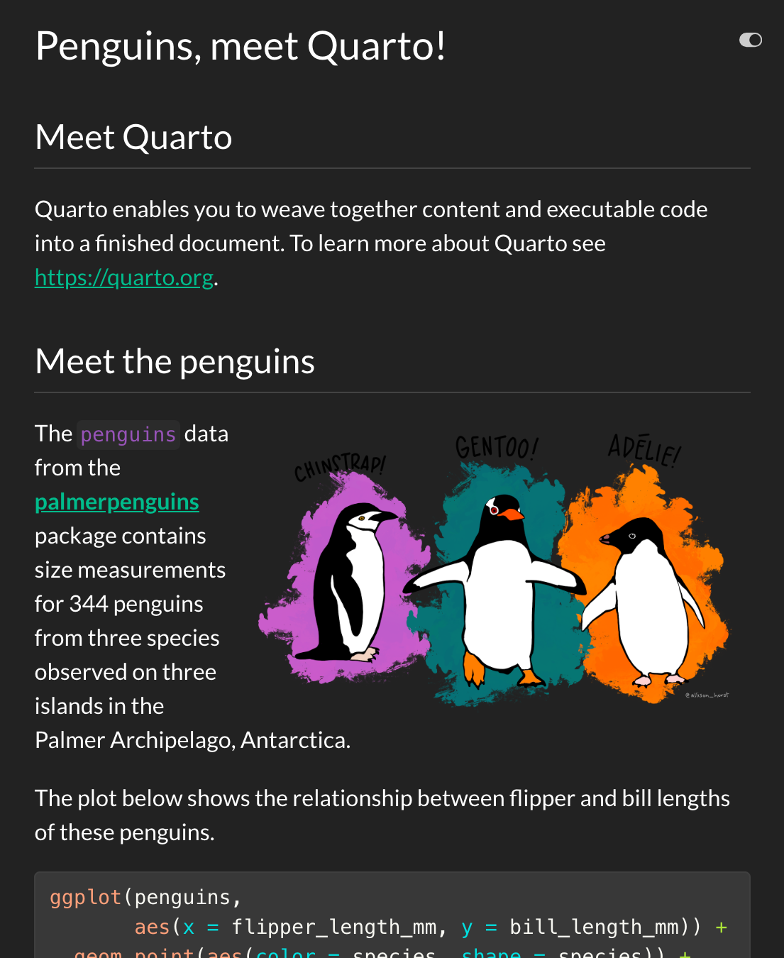 Quarto also allows you to use a dark and light theme.